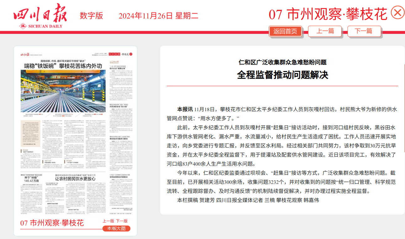 四川日报关注:仁和区广泛收集群众急难愁盼问题 全程监督推动问题解决