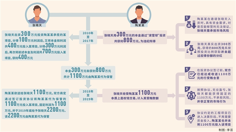 陈冠言:审查调查过程中,我们发现张晓天与陶某某的“合作投资”均有相关投资入股协议等书证予以证实,陶某某帮助张晓天代为保管的2200万元,看似通过张晓天用其子名义“投资—获利—再投资—再获利”的行为,以“滚雪球”的方式逐渐累积而来,系张晓天的投资本金及利润。但结合双方证言及客观情况,我们发现张晓天与陶某某“合作投资”实则分为三个部分: