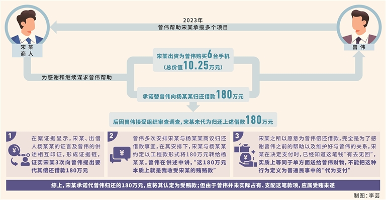 其中,2023年,曾伟利用职务上的便利,帮助商人宋某承揽多个项目。为感谢和继续谋求曾伟在工程承揽等方面的帮助,宋某出资为曾伟购买6台手机(总价值10.25万元),并3次表示替曾伟向杨某某归还借款180万元,曾伟表示同意。后因曾伟接受审查调查,宋某未按约定代为归还上述借款180万元。